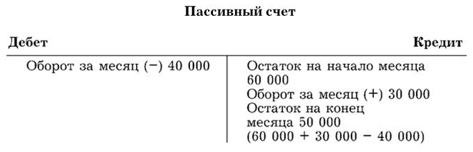 Чтобы получить остаток на конец месяца по пассивному счету, необходимо к остатку на начало месяца по кредиту счета прибавить оборот по кредиту счета и вычесть оборот по дебету этого счета, а вновь полученный остаток записать по кредиту счета. Схема пассивного счета: