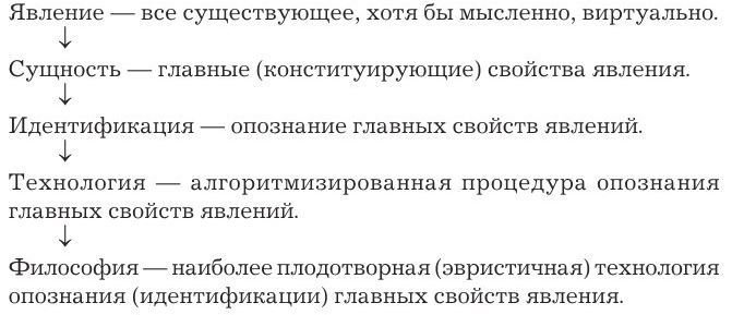 Явления – все существующее, сущность – конституирующие признаки явлений, идентификация – опознание сущности, технология – алгоритм познания сущности, философия – универсальная технология познания сущности.
