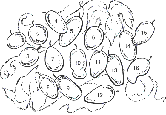 Рисунок 7. Виды виноградных ягод по форме: 1) сплюснутая; 2) округлая; 3) овальная; 4) продолговатая; 5) длинная; 6) яйцевидная; 7) обратнояйцевидная; 8) с выпуклыми сторонами; 9) цилиндрическая; 10) с перехватом; 11) сосковидная; 12) заостренная; 13) притупленная; 14) пальцевидная; 15) слабо изогнутая; 16) сильно изогнутая
