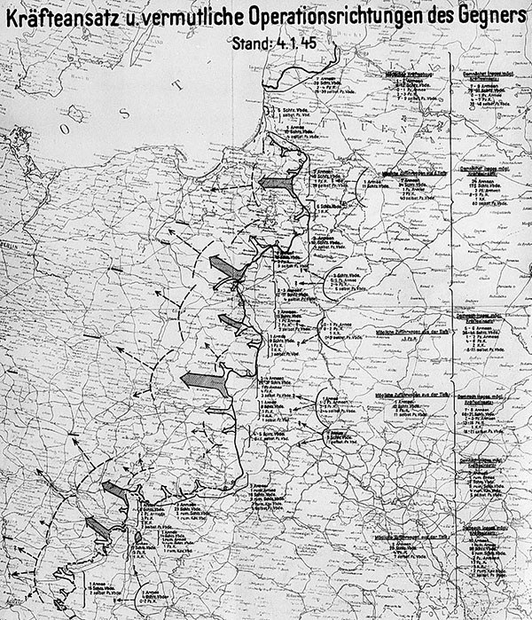 Представление немецкой разведки о планах советского командования по состоянию на 5 января 1945 г. Размер стрелки пропорционален силе предполагаемого удара