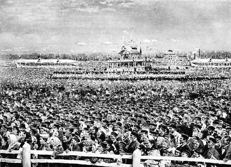 Вскоре случившееся получило свое объяснение. Мимо нас проехал большой караван открытых телег, из-под покрывал свешивались безжизненные руки и ноги. На близлежащем Ходынском поле произошло ужасное несчастье. Толпы людей устремились к палаткам, где раздавали прохладительные напитки и маленькие сувениры. Началась паника, людей сбивали с ног и затаптывали насмерть. Говорили, что погибло около двух тысяч человек.