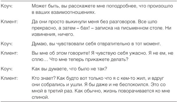 Наверное, этого недостаточно для спасения отношений, но это может повысить уровень знания клиента по сравнению с тем, какой был бы у него, оставайся он на позиции жертвы. Обратите внимание, что во второй части приведенного диалога клиент говорит как более сильный, более осознающий ситуацию человек. Он обсуждает то, что ему подконтрольно: сохранить отношения или нет, говорить с партнером или нет. В конечном итоге, когда мы работаем с человеком, чтобы осуществить перемены в его жизни, такой свежий взгляд может оказаться именно тем, что необходимо для представления ситуации в новом свете.