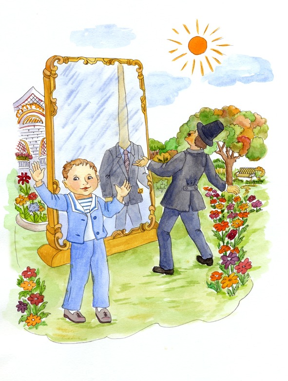 Пришел туда и главный наш герой. Торжественно зашел он в арку, полюбовался красотой цветов, присел на край скамейки и робко посмотрел в зеркало. Наш мальчик делал это в первый раз. Вокруг бы- ли взрослые люди и даже пожилые. Ваня знал, что это место волшебное, и поэтому очень волновался. Ему предстояло первый раз узнать, правильно ли он живет? В зеркале отразился свет его глаз – от доброй улыбки. Лучики тепла побежали от отображения в душу мальчика и согрели его. Мальчику захотелось быть еще лучше, и он стал думать, что хорошего он сможет совершить, кому он еще сможет помочь?