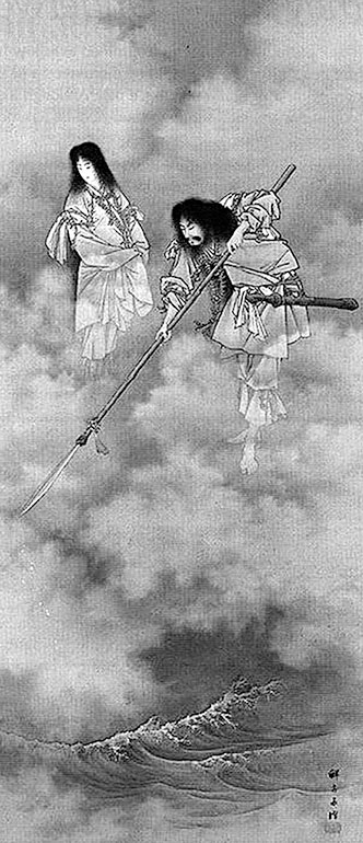 Древние японские книги, «Кодзики» и «Нихон сёки», составленные в начале VIII века, повествуя о происхождении мира, рассказывают, что когда-то давным-давно на Равнине Высокого Неба появились первые боги. Причем были они невидимы, и никто не знал их имен. Неизвестно, сколько времени прошло, прежде чем там же появились и другие боги, и среди них Идзанаги и Идзанами – брат и сестра и первые из богов, чьи имена стали известны людям. Старшие боги поручили им сотворить землю и дали в руки волшебное копье. И вот, разглядывая с Небесного Плавучего Моста покрывающий Землю Океан, брат и сестра погрузили в него копье и взбаламутили его воды. Когда же они вытащили его из воды, с его наконечника сорвались капли, которые упали вниз и застыли, превратившись в Оногородзима – «Сам собой сгустившийся остров». Божественная пара спустилась на остров, а яшмовое копье использовала в качестве опорного столба в своем доме. Брат и сестра стали супругами и породили множество детей, и среди них – Японские острова.