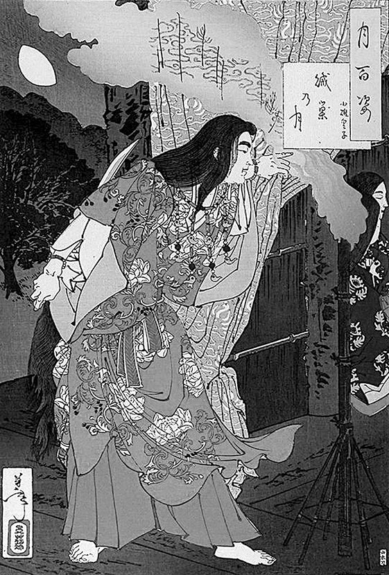 Ямато Такэру в костюме служанки готовится убить вождя Кумасо. Ксилография Цукиоки Ёситоси (1839–1892).