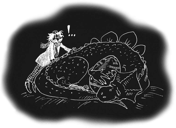 Та результати його «наукового обмацування» свідчили самі за себе. По-перше, знайдене «щось» мало досить великі задні лапи, взуті в теплі домашні капці. По-друге, його хвіст був довгий і досить вгодований. По-третє, по спині й хвосту тягнувся роговий гребінь, подібний до гребеня ігуан – сучасних спадкоємців давніх динозаврів. По-четверте: «щось» мало невелику як на таке тіло голову. Ну, і по-п’яте, воно цупкими лапками притискало до грудей округлої форми предмет, дуже схожий на велике яйце.
