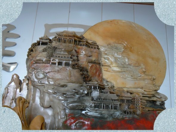 Принцесса Слива обратила внимание, что у основания двери была вырезана ещё одна дверца. Дверца была маленькой. Вот ее дети открыли без труда. И без труда в неё проникли. За дверцей была лестница. Лестница вела вниз. Когда дети спустились, они увидели, что внизу находится подземный город. Город был огорожен оградой из нефритовых досок. Рубиновые ворота были открыты. Над воротами висела табличка на золотой цепочке. Надпись на табличке гласила: «Путник, ты находишься у ворот города Чжень.»
