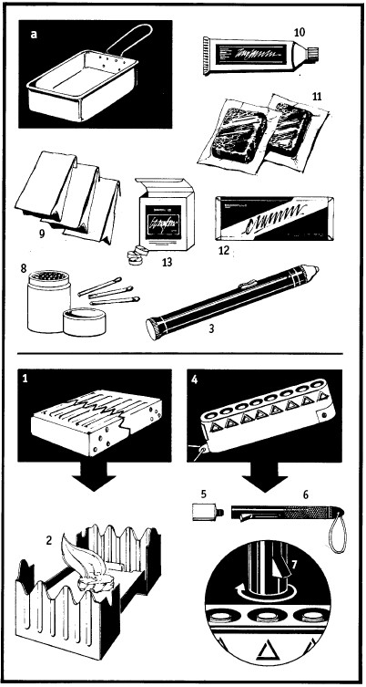 Желательно иметь таблетки сухого горючего (сухого спирта) в раскладном контейнере-плитке (походной спиртовке) (1). Используйте его бережливо, и только там, где нет древесного топлива или применять его неудобно. Таблетки – отличный материал для разжигания огня. Плитка просто раскладывается, превращаясь в подставку для котелка (2) и очаг для горящего топлива.