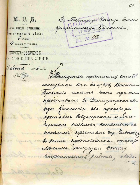 Повенецкая уездная землеустроительная комиссия за №988 от 12.11.1912 г. сообщила в Управление Земельного и Государственного имущества Олонецкой губернии о сроках проведения землеустроительных работ (с 15 мая по 1 октября 1913г.)37.