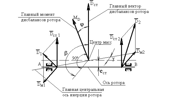 При статической балансировке определяется и уменьшается главный вектор дисбалансов ротора, характеризующий его статическую неуравновешенность. Главный вектор дисбалансов равен сумме всех векторов дисбалансов, расположенных в различных плоскостях, перпендикулярных оси ротора (см. рис. 4).