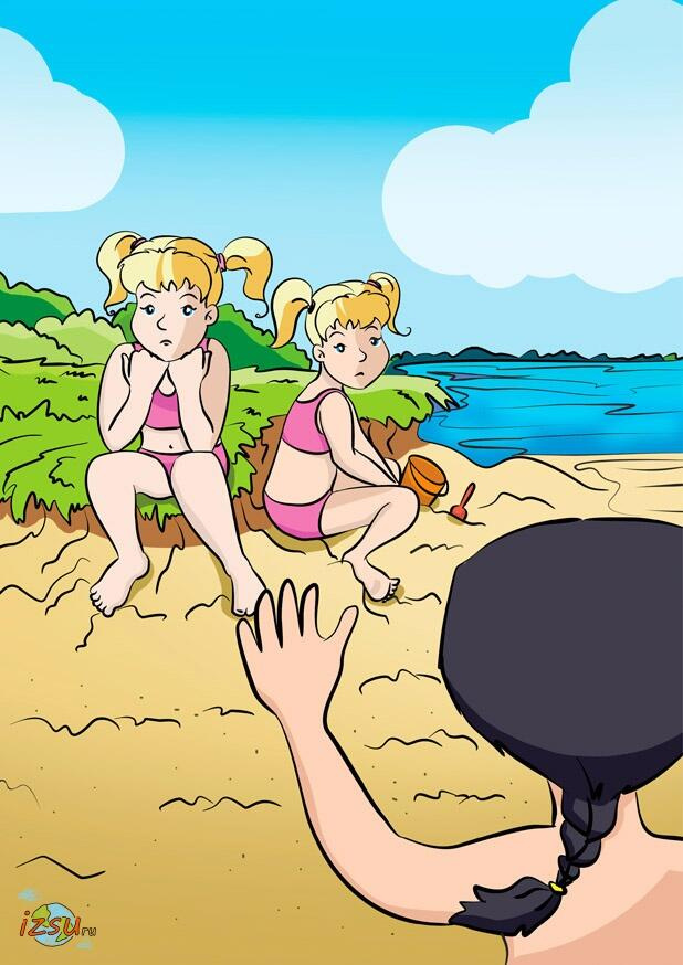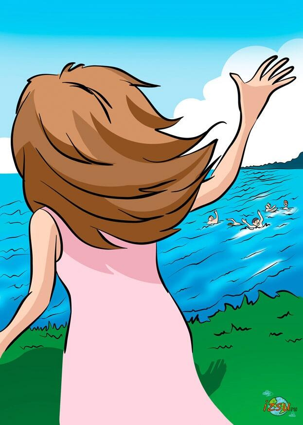 Костя посмотрел на берег и заметил, что Маша и Катя сидели возле воды и не купались. Но они смотрели на всех с такой завистью!