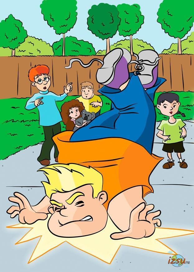 Я сматываюсь! хулиган попытался быстро исчезнуть, как вдруг наступил на собственные шнурки, споткнулся и упал.