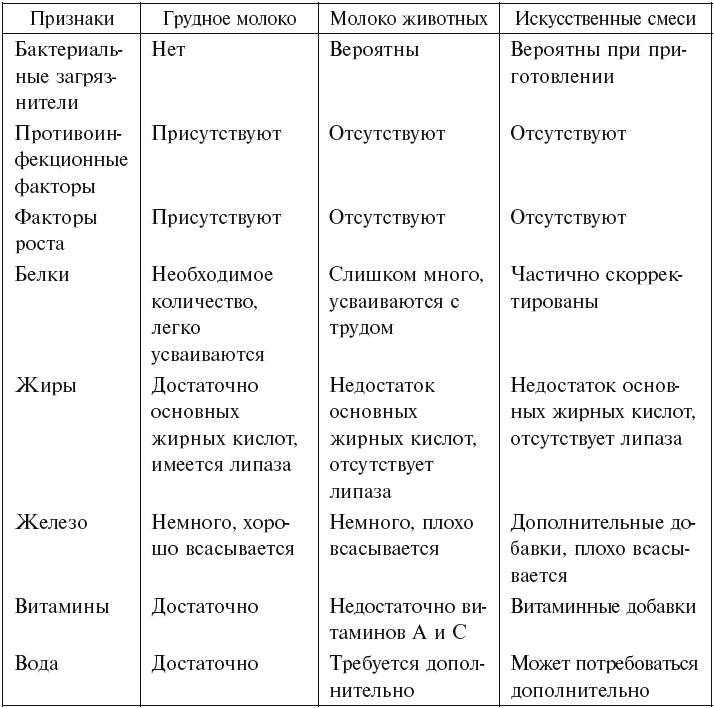 Основные отличия грудного молока и искусственного питания представлены в табл. 2 и прил. 1–4.