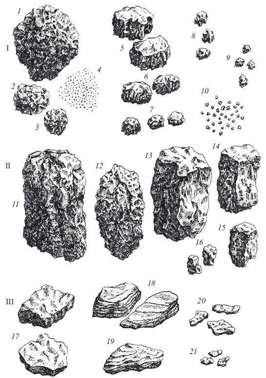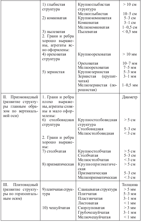 I тип: 1 – крупнокомковатая; 2 – среднекомковатая; 3 – мелкокомковатая; 4 – пылеватая; 5 – крупноореховатая; 6 – ореховатая; 7 – мелкоореховатая; 8 – крупнозернистая; 9 – зернистая, 10- порошистая; II тип: 11 – столбчатая; 12 – столбовидная; 13- крупнопризматическая; 14 – призматическая; 15 – мелкопризматическая; 16 – тонкопризматическая; III тип: 17 — сланцевая; 18 – пластинчатая; 19 – листовая; 20 – грубочешуйчатая; 21 – мелкочешуйчатая