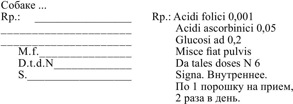 1. Inscriptio (заглавие) – включает штамп лечебного учреждения, дату написания рецепта, кому предназначено лекарство, Ф.И.О. владельца животного и Ф.И.О. выписавшего рецепт;