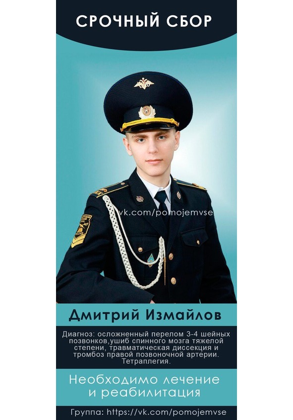 Расскажу вам историю о молодом человеке, который мечтает стать офицером. Его зовут Измайлов Дмитрий, ему 21 год. Дима – курсант 2 курса Военного университета Минобороны РФ, спортсмен, единственный сын своих родителей, верный друг, смелый, добрый и веселый парень.