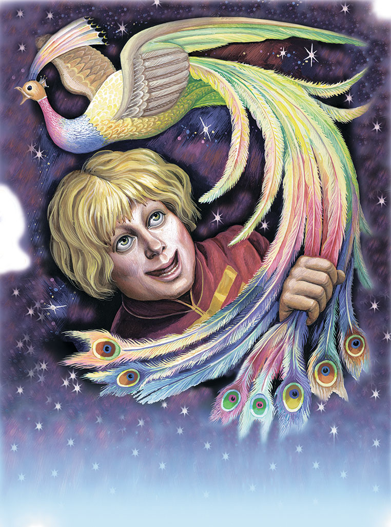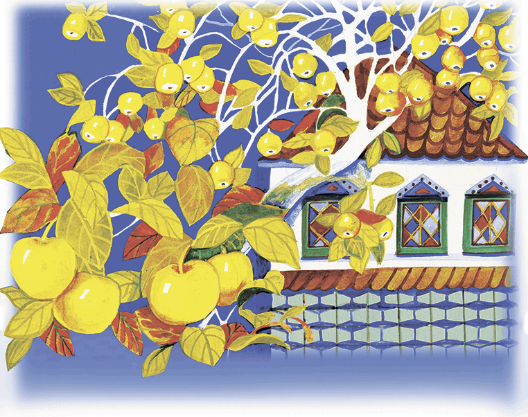 Половина ночи прошла, ему и чудится: в саду свет. Светлее и светлее. Весь сад осветило. Он видит – на яблоню села Жар-птица и клюёт золотые яблоки.