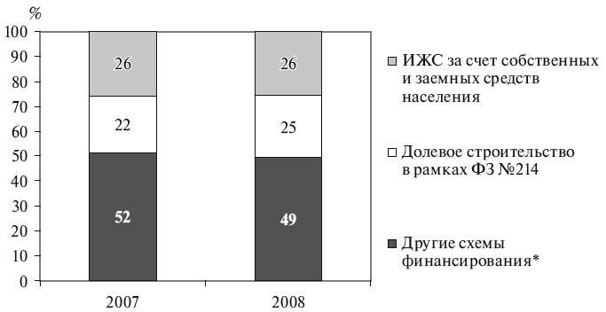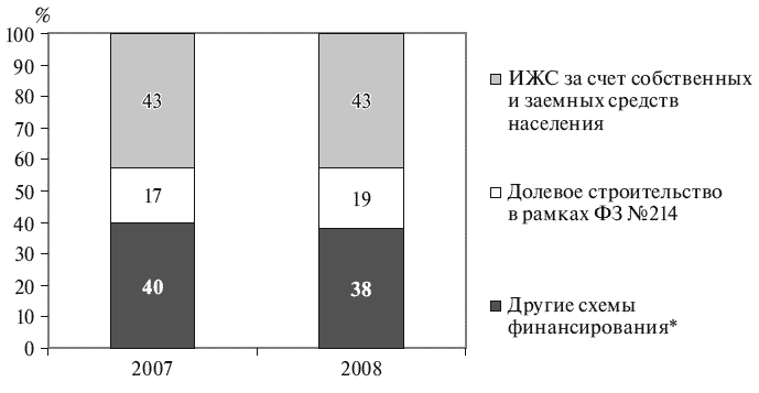 Основным источником финансирования жилищного строительства в России до начала кризиса являлись средства населения, в том числе предоставленные гражданам кредиты на строительство жилья (рис. 1.17). Так, 43 % площади жилья, введенного в эксплуатацию в 2008 г., было построено населением за свой счет и с помощью кредитов (индивидуальное жилищное строительство), а 19 % профинансировано населением в рамках Федерального закона об участии в долевом строительстве многоквартирных домов (в 2007 г. только 17 %)[9]. 38 % жилья построено за счет средств инвесторов – юридических лиц; привлеченных застройщиками кредитных средств; бюджетных средств и опять же средств граждан, только привлеченных застройщиками в обход упомянутого Федерального закона. При этом доля средств населения увеличилась как минимум с 60 % в 2007 г. до 62 % в 2008 г. (эта доля не включает средства населения, привлеченные застройщиками по серым схемам в обход федерального законодательства, поскольку размер таких средств трудно поддается оценке).