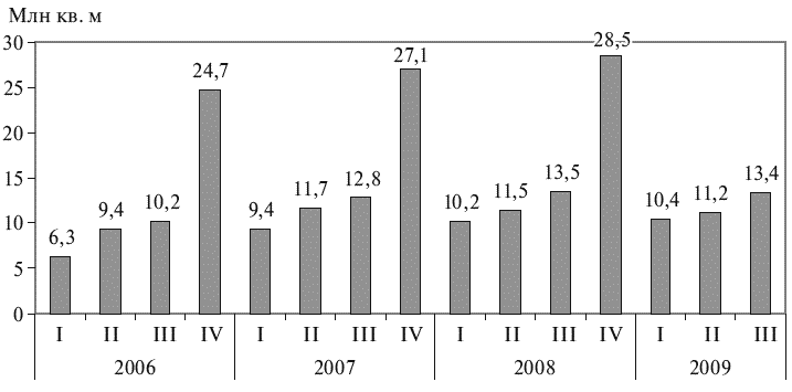 Необходимо заметить, что традиционно основной объем ввода жилья приходится на IV квартал (в 2008 г. было введено 44,7 % годового объема). По итогам года можно было ожидать ввода примерно 60 млн м