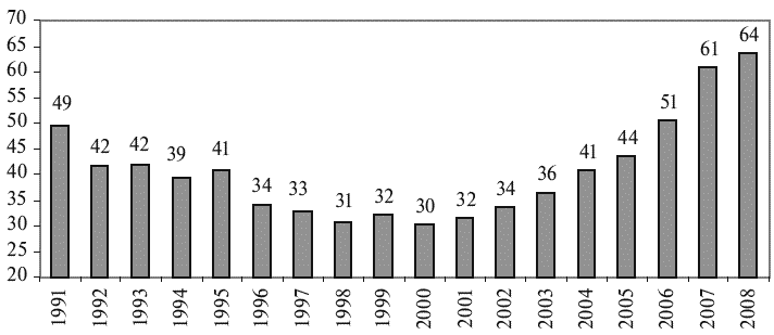 Рис. 1.14. Ввод жилья в России за 1991–2008 гг., млн м