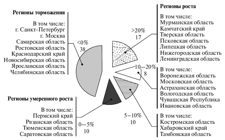 Рис. 1.16. Распределение субъектов Российской Федерации по темпам прироста объемов ввода жилья за 9 месяцев 2009 г. (по количеству субъектов РФ)
