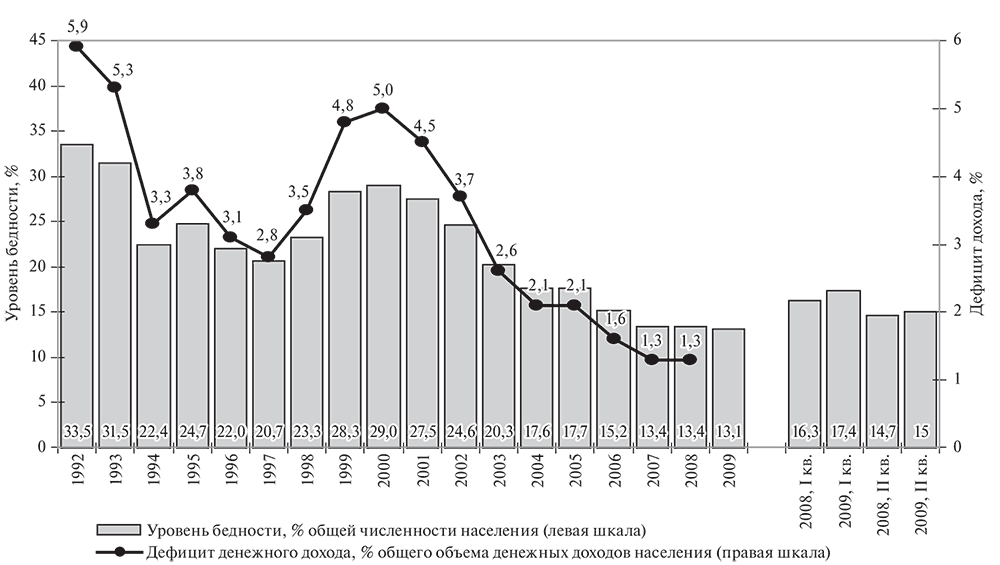 В целом за период рыночных преобразований уровень бедности, как и доходы, был подвержен значительным колебаниям, а в 1992 г., после либерализации цен, в число бедных попала треть российского населения, дефицит дохода тогда составил 6 % общего объема денежных доходов населения. С 2001 г. наблюдается устойчивая тенденция к снижению доли бедного населения, за период 2000–2007 гг. она сократилась в 2 раза. Текущий кризис привел к росту бедности на 1 % в I кв. 2009 г. по сравнению с аналогичным периодом 2008 г., что соответствует увеличению числа бедных на 1,5 млн чел. По итогам сравнения за шесть месяцев 2008 и 2009 гг., в рамках которого сохраняется эффект сопоставления докризисных и послекризисных показателей, эффект роста бедности становится менее очевидным: с 14,7 до 15 %. Годовые данные позволяют сделать вывод о том, что 2009 г. стал годом минимального уровня бедности за всю историю постсоветского развития. В какой-то степени ситуация выглядит парадоксальной: в год кризисного состояния экономики мы наблюдаем уровень бедности ниже, чем на пике экономического роста. При этом ВВП в 2009 г. составил 97,3 % уровня 2007 г. Объяснения следует искать в развитии пенсионного обеспечения и росте минимальной заработной платы: в начале 2009 г. минимальная заработная плата возросла в 2 раза, а средняя реальная пенсия – в 1,77 раза. То, что бедность достигла минимума на фазе падения ВВП, создает существенные риски для последующего развития. Ситуация усугубляется еще и тем, что доходы растут за счет социальных, а не рыночных, источников денежных средств. В целом вектор социально-экономической динамики формирует серьезные риски для развития в ближайшей перспективе.