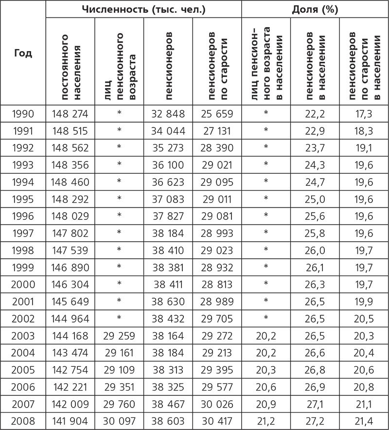 * В связи с пересчетом численности населения в период 1990–2001 гг. по итогам переписи 2002 г. оценки численности лиц пенсионного возраста до переписи 2002 г. не приводятся, поскольку отсутствуют в официальных публикациях уточненных данных.