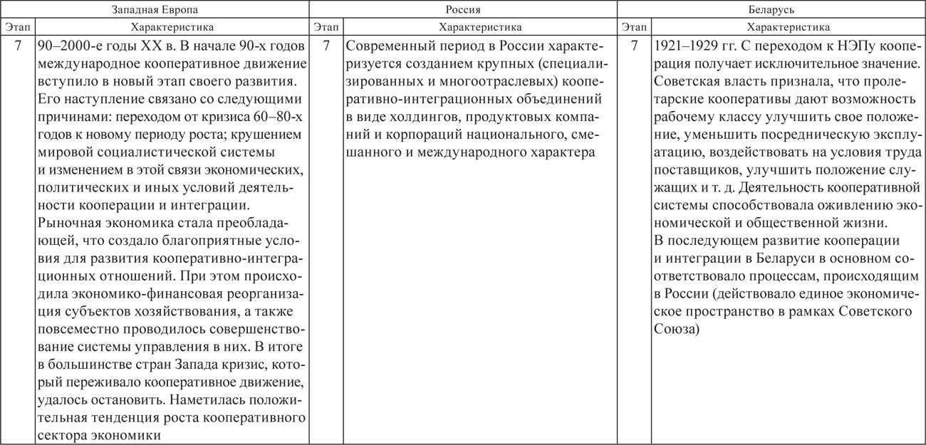 Кроме того, на каждом конкретном историческом этапе развития кооперация и интеграция имеют свои характерные особенности, присущие определенному экономическому укладу. В этом плане кооперацию и интеграцию следует рассматривать как общественно-экономические процессы, возникающие на конкретной стадии развития производительных сил и обеспечивающие устойчивое (результативное) функционирование субъектов хозяйствования на основе взаимодействия и взаимодополнения ресурсов, труда, капитала и организации совместной деятельности. В соответствии с этим, для более полного раскрытия вопроса, нами проведен сравнительный анализ основных исторических этапов формирования кооперации и интеграции в странах Западной Европы, России и Беларуси (табл. 1.3) [19, 29, 30, 44, 59, 82, 93, 110, 127, 132, 162, 192, 201, 210, 213, 249, 251].