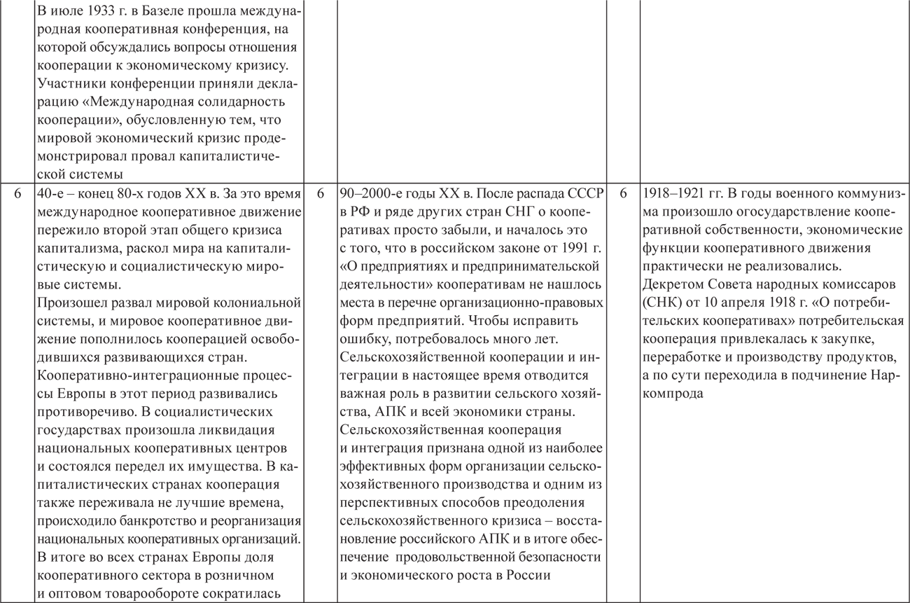 Таким образом, из выполненного сравнительного анализа основных исторических этапов формирования кооперации и интеграции можно сделать следующие выводы: кооперация развивалась весьма противоречиво, волнообразно, с усилиями пробивая свой путь; кооперация на разных этапах соответствовала уровню и характеру развития производственных, экономических и общественных отношений в каждой стране; кооперация смогла адаптироваться к самым неблагоприятным условиям и проявила свою возможность приспосабливаться, в связи с чем могла выживать; на каждом новом этапе создавались потенциальные возможности для более широкого и устойчивого развития кооперации; кооперация стала отражать не только интересы непосредственно товаропроизводителей, которые объединяли свои ресурсы и капиталы, но и предпринимателей из обслуживающих и снабженческо-сбытовых сфер, особенно в сфере торговли; кооперация и интеграция смогли выработать наиболее сильные механизмы экономической заинтересованности различных участников (в силу чего в кооперацию втягивались все новые и новые сферы хозяйствования); кооперация и интеграция развивались по восходящей – от более простых форм к сложным, кооперативные отношения переплетались с общественными и государственными, в силу чего кооперация и интеграция, несмотря на свои противоречия, становились обязательными и неотъемлемыми формами и методами хозяйствования, особенно при недостатке средств у индивидуальных товаропроизводителей и осложнении условий хозяйствования, когда разрозненные товаропроизводители не могли самостоятельно выживать [13-А].