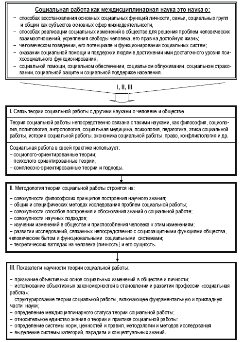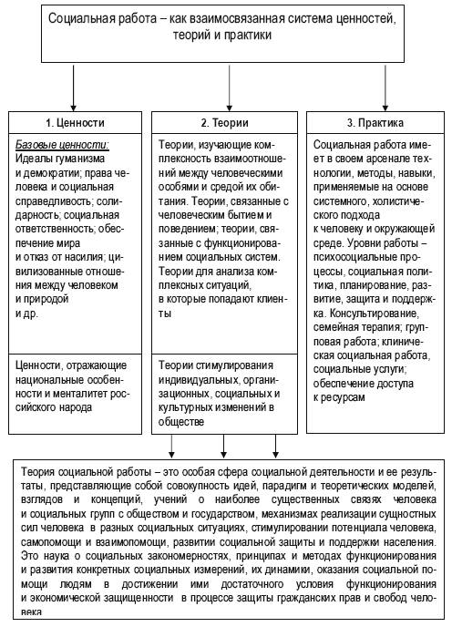 6. Институционализация теории социальной работы – процесс разработки, определения содержания основных положений, закрепления системы научных знаний в области социальной работы и адаптации зарубежных парадигм, теорий и теоретических моделей социальной работы, способных функционировать в направлении удовлетворения общественной потребности в становлении и развитии социальной науки и социального образования в России; результат процесса теоретического обоснования базовых моделей социальной защиты и социальной поддержки населения; становление устойчивых структур практической организации социальной работы.