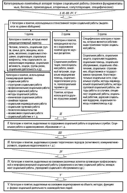 В отдельных учебниках и учебных пособиях выделяются другие группы категорий и понятий по таким основаниям, как содержание социальной работы в различных сферах жизнедеятельности (в здравоохранении, образовании, социальной защите, на производстве, в сельской местности, пенитенциарных учреждениях и т. д.), рамки теоретических подходов (когнитивный, коммуникативно-ролевой, социально-педагогический, социально-медицинский и т. д.), специфика организации профессиональной и непрофессиональной работы (менеджмент в социальной работе, учреждения и предприятия социального обслуживания и др.), акцентирование внимания на специфике объектов, методов, функций и форм социальной деятельности, взаимодействия людей и т. д.