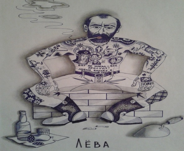 От самых ногтей на ногах и до волосатого кадыка, Лев был сплошь синий от многочисленных татуировок. Все пальцы его рук пестрели: кольцами и перстнями, загадочными цифрами и подозрительными буквами, зашифрованными датами и вопросительными знаками. На левой кисти был изображён «весёлый роджер», на правой: паук, запутавшийся в собственной паутине. Далее, вверх по рукам, шли вереницей: шипастые розы и окровавленные шпаги, тузы во главе с джокером и цепи всех модификаций, коронованные змеи и факелы, обмотанные колючей проволокой, женщины в спартанских шлемах и пузатые ангелочки, полные шприцы и очень длинные дымящиеся папиросы. На одном Лёвином плече базировался гусарский эполет, на другом: затейливый погон неизвестной республики. Под обеими ключицами красовались восьмиконечные звёзды. На левой груди было зафиксированно страшно возмущённое животное семейства кошачьих, на правой: печальноокая мадонна с великовозрастным младенцем на руках. Широко улыбающаяся физиономия подростка, удивительно напоминала веснушчатую мордашку вождя краснокожих, с которым были жуткие проблемы у Георгия Вицына… и особенно у Алексея Смирнова. На животе у Льва Яковлевича фигурировали две сентенции, настораживающие своей филосовской скрытностью: