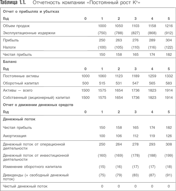 Предположим, что у компании не будет долгов и денежных средств на балансе. Таким образом, объем дивидендов каждый год должен равняться денежному потоку за вычетом капитальных затрат и изменения оборотного капитала (свободный денежный поток). В табл. 1.1 приведены отчет о прибылях и убытках, бухгалтерский баланс и отчет о движении денежных средств компании «Постоянный рост К°».