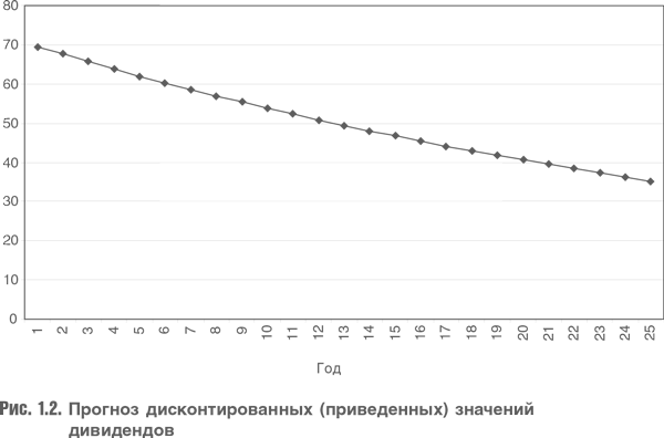 Проблема заключается в том, что каждый прогнозируемый показатель больше предшествующего. Но решение есть. Если ставка дисконтирования больше темпа роста, то дисконтированный поток дивидендов к текущим (приведенным) значениям будет уменьшаться (рис. 1.2).