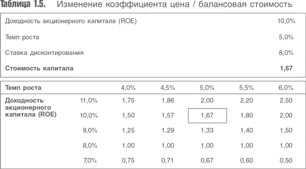В табл. 1.5 показана зависимость коэффициента «цена / балансовая стоимость капитала компании» от изменения темпов роста и доходности собственного (акционерного) капитала. Эта таблица похожа на приведенную выше таблицу, значения которой рассчитывались с использованием данных о доходе. Аналогичные комментарии, естественно, применимы к соотношению прибыльности, роста и стоимости. Почему ответы одинаковы только для строки, в которой доходность на собственный (акционерный) капитал равна 10 %? В соответствии с табл. 1.3, на 1000 ед. инвестированного капитала с доходностью 10 % мы получили 100 ед. прибыли, но мы не учитывали ожидаемую доходность нового капитала. Теперь же мы предположили, что новый и старый капитал приносят одинаковую доходность. Различие имеет решающее значение (хотя часто игнорируется в оценочных моделях), и мы вернемся к нему в главе 3.