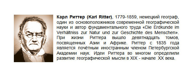 «География – это своеобразная физиология и сравнительная анатомия Земли: реки, горы, ледники и т. п. являются отдельными органами, каждый из которых имеет свои собственные функции, а так физико-географическое основание является основой для развития общества, оно в качестве физической основы определяет ход жизни общества и человека». Карл Риттер, 1817 год.