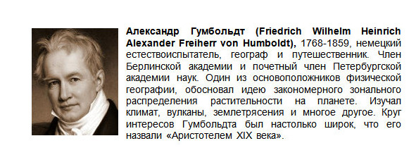Интенсивность и частота природных бедствий на новых землях пугала, настораживала и требовала осмысления. Это была уже не задача картографов и описателей, а учёных вооруженных знаниями и точными инструментами. Особый вклад в становление физической географии как точной науки внёс немецкий учёный Александр Гумбольдт. Он считал необходимым комплексное постижение природы как единого целого.