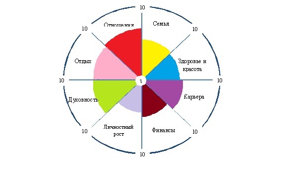 Оцените, насколько по шкале от 1 до 10 наполнена на сегодня каждая сфера вашей жизни? Зарисуйте каждый сектор тем цветом, который ассоциируется у вас с этой сферой. Результат работы над «колесом» в качестве примера представлен на рис.2.