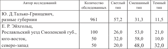 На основании анализа материалов описательной части исследований были выделены три антропологических типа: светлый, смешанный и темный. Группировка белорусских крестьян на основании данных исследований конца XIX ст. дала следующие результаты (табл. 1.4) [523, 610].