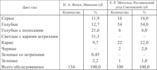 По цвету радужной оболочки глаз обследованные Е. Р. Эйхгольцем крестьяне распределялись по-разному. Результаты приведены в табл. 1.3 [610, 615].