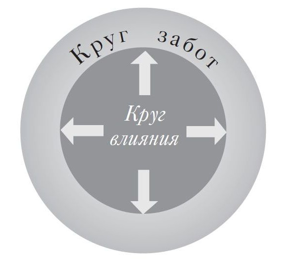 Представьте, что в вашей жизни есть два условных круга (см. рис.1). Внутренний круг – круг влияния, это зона прямого контроля, где вы легко контролируете поведение, объекты, действия: что надеть сегодня утром, выбрать то или это, сказать что-то или не сказать и т. п.