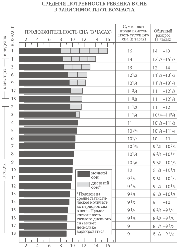 Одна из наименее очевидных проблем – это недосыпание. По одной только продолжительности суточного сна невозможно судить, высыпается ли конкретный ребенок. В таблице ниже приведены данные о потребности детей в дневном и ночном сне. Большинство малышей более-менее вписываются в эти данные с отклонениями в пределах часа. В течение первых месяцев жизни общая продолжительность суточного сна быстро снижается до 11–12 часов. Дальнейшее снижение идет значительно медленней. Дети на удивление «единодушны» в отношении общей продолжительности сна, хотя могут по-разному распределять часы своего отдыха. Если один девятимесячный малыш может спать девять часов ночью и два раза по полтора часа днем, то другой после 12-часового ночного сна в дневное время лишь ненадолго прикорнет.