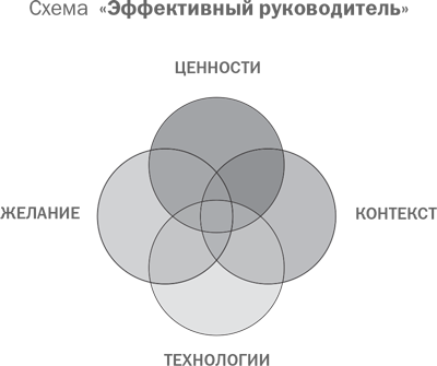 Итак, для того чтобы реализовать себя в качестве руководителя, вам необходимо учитывать четыре основных фактора, определяющих управленческую деятельность: желание, ценности, контекст и технологии. Визуализируем: