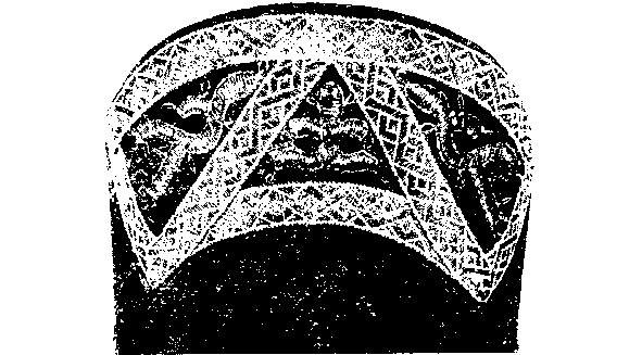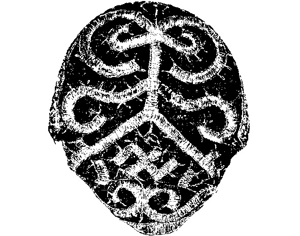 В северодвинских, конкретно черевковских, повойниках центральная фигура соединена полоской, опускающейся также между широко расставленными ногами, с треугольником или трехступенчатой пирамидой (илл. 2, 3). Но треугольник и ступенчатая пирамида во многих древнеземледельческих культурах, еще со времен энеолита, являлись знаком женского производящего начала, символом рождения и воспроизводства.