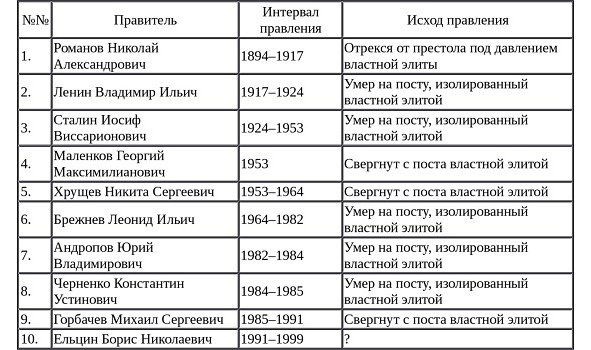 Напротив десятого правителя стоит знак вопроса – статья46 Владимира Баранова была написана до отставки трудоголика Ельцина, положившего все свое недюжинное здоровье на «работу с документами». Сегодня мы знаем, что в пустующей графе должно быть написано: «Отрекся от престола под давлением властной элиты».