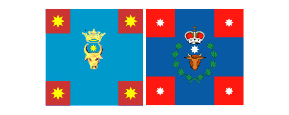 Известно и молдавское военное знамя 1834—1859 гг. Это квадратное синее полотнище, в углах которого на красных квадратах – восьмиконечные звезды, в центре – голова буйвола под звездой и короной.