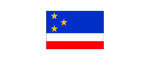 Согласно закона Флаг (пропорции 1: 2) состоит из трех горизонтальных полос разной ширины. Верхняя, синяя полоса – 6/10 ширины флага; средняя, белая и нижняя, красная полосы – по 2/10 ширины шлага. На синей полосе расположены треугольником три желтые звезды; диаметр окружности, описанной около звезды, равен 15/100 ширины флага, расстояние между звездами и от древка до центров двух крайних звезд равно 3/10 ширины флага.