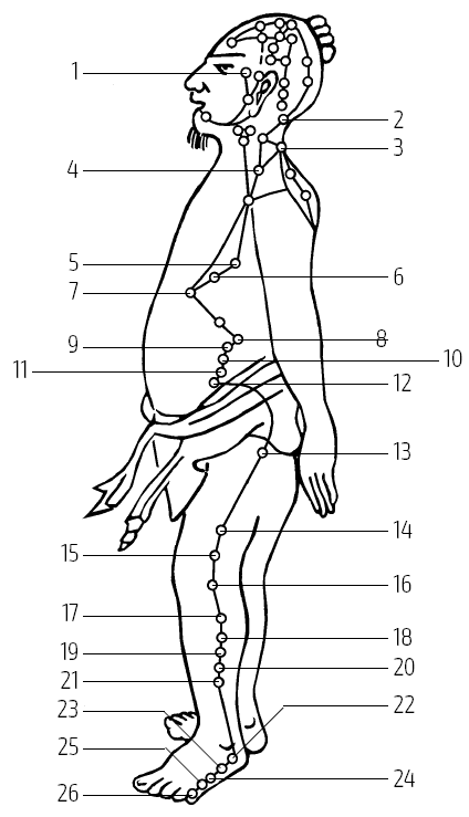 1 – тунцзыляо; 2 – фэнчи; 3 – дачжуй; 4 – цзяньцзин; 5 – юанье; 6 – чжэцзинь; 7 – жиюэ; 8 – цзинмэнь; 9 – вэйдао; 10 – даймай; 11 – цзюйляо; 12 – ушу; 13 – хуаньтяо; 14 – чжунду; 15 – цзуянгуань; 16 – янлинцюань; 17 – янцзяо; 18 – вайцю; 19 – гуанмин; 20 – янфу; 21 – сюаньчжун; 22 – цюсюй; 23 – цзулиньци; 24 – диухуэй; 25 – сяси; 26 – цзуцяоинь.