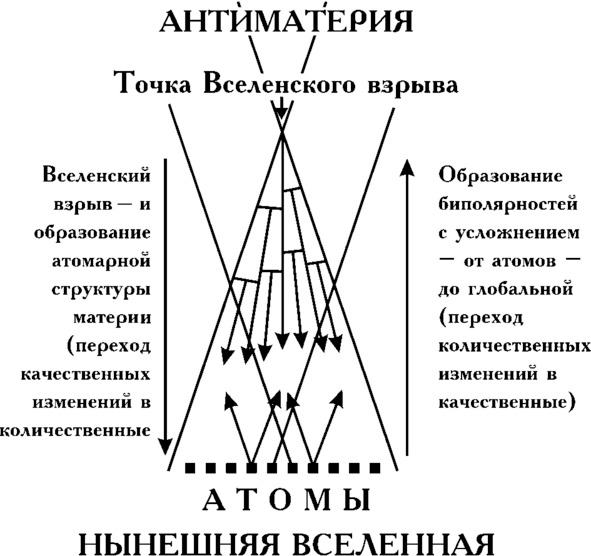 Посмотрим на наш рисунок. Если наше допущение верно, и наша нынешняя Вселенная – один из полюсов биполярной конструкции МАТЕРИЯ (1) – АНТИМАТЕРИЯ (2), то что является образующая данную БК среда? ЧТО ЭТО ТАКОЕ? Смотрим на рисунок. Это остатки некоей первосреды, давшей начало БК: Первоматерия-Перводух (на рисунке мы назвали ее условно СРЕДА ПЕРВОСУТИ); но и до нашей Вселенной образовывались некии (кроме вышеуказанной) биполярные конструкции, которые не исчезли бесследно; они явились основой образования нисходящих по уровню сложности БК – вплоть до нынешней нашей Вселенной. Согласно нашей теории, БК предыдущие входят составной частью в БК последующие – образования более высокого уровня. Но предшествующий процесс согласно схемы стр.19, идет в двух встречных направлениях – по пути упрощения и по пути усложнения многочисленных БК. Вот этот рисунок:
