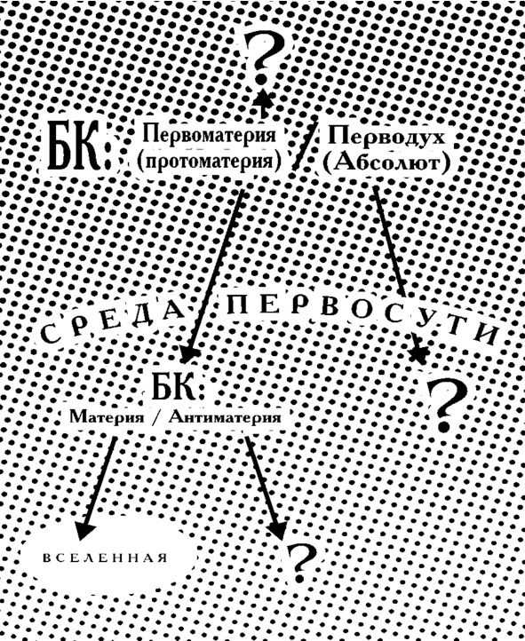 А ведь мы даже представления не имеем, как разделялась Первосуть (и что, собственно, это такое с точки зрения состояния и строения пространства и его частей), далее – что за триединая БК образовалась в результате. Почему, собственно, мы считаем, что полюса в дальнейшем разделении – это Первоматерия и Абсолют? Не подразумеваем ли мы тем самым, что некогда ГДЕ-ТО, КОГДА-ТО была некая биполярная конструкция, подобная нынешней Вселенной, и именно она лежит в истоках образования нашей Вселенной именно в таком виде, какой она имеет.